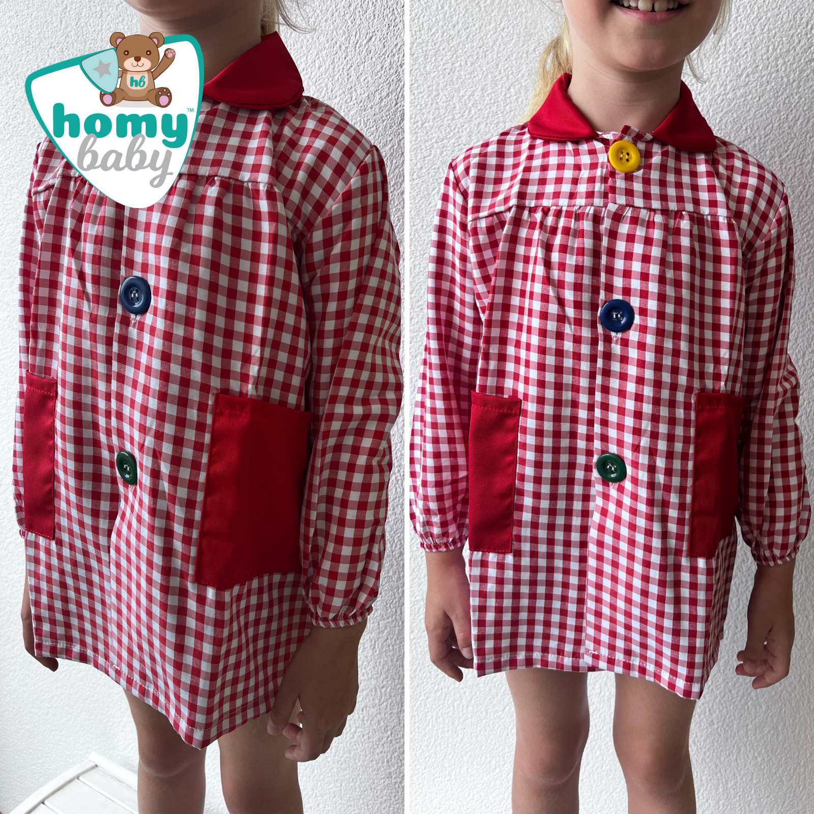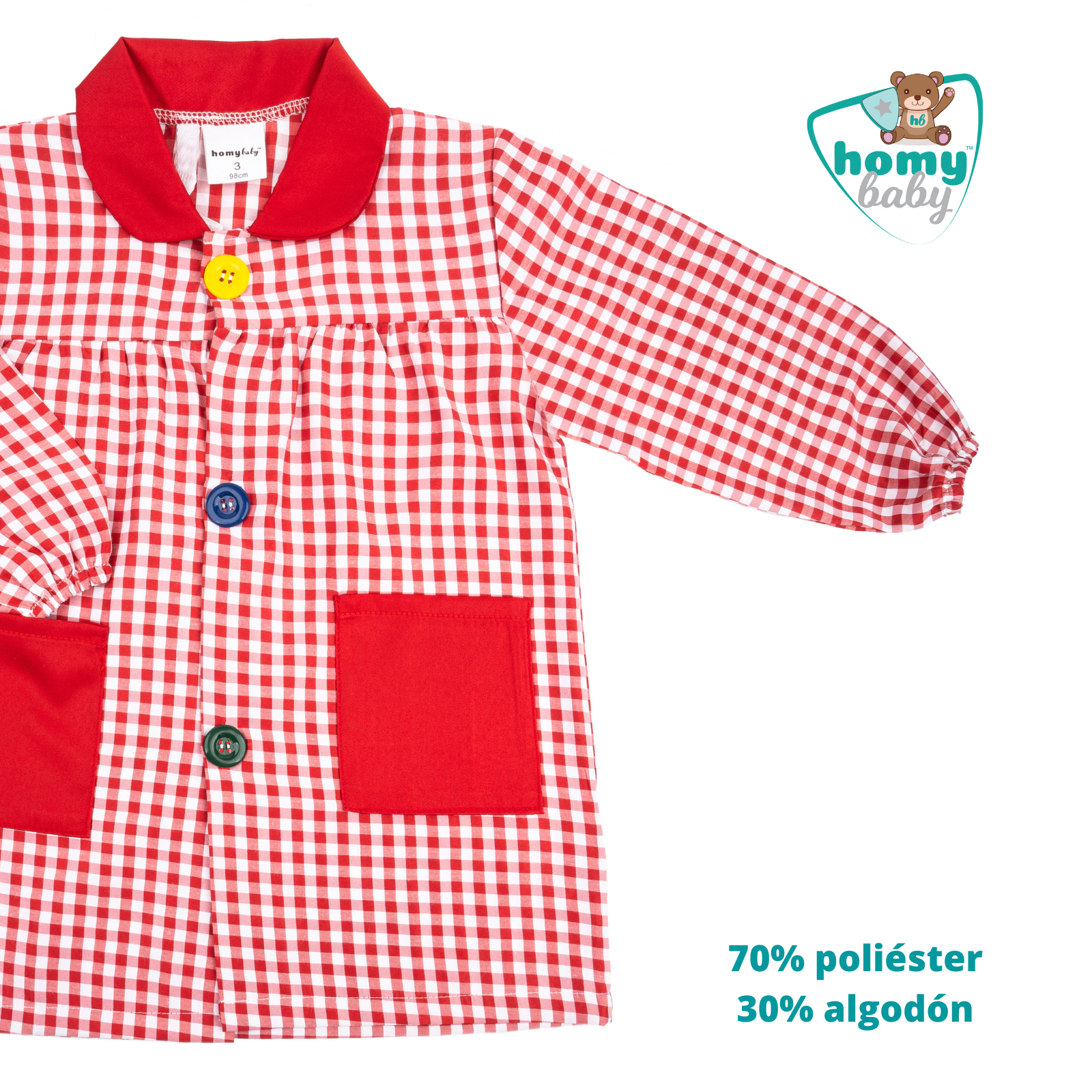 La bata tiene un tejido que gana suavidad con los lavados, es apto para lavar a máquina. Su composición es 65% Poliéster y 35% Algodón. Es muy fácil de poner y es unisex para niños y niñas. Estampado tipo vichy a juego con cualquier tipo y color de ropa. El baby es cómodo para su hijo, tejido suave que pesa poco para utilizarlo en el día a día de la etapa infantil.